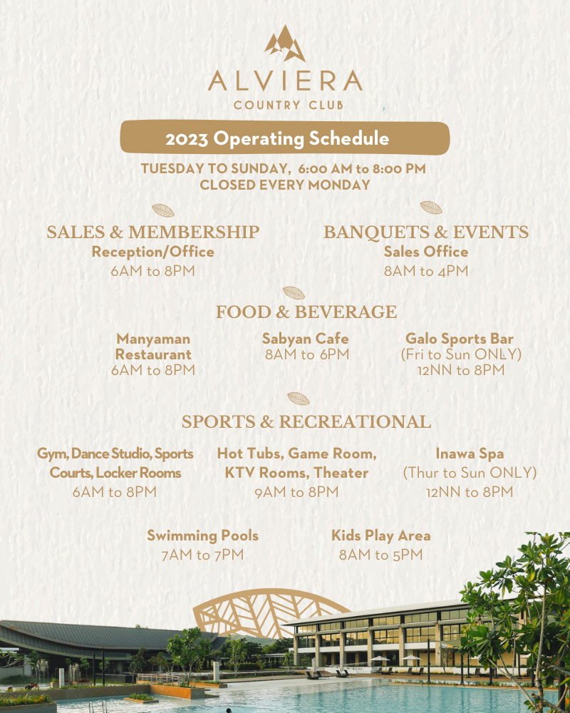 You deserve a much needed treat from the hustle and bustle of the city. Relax and and take a breather at Alviera Country Club! See our updated schedule and visit us soon. For inquiries, please text or call us at 0917 806 2377 or email us at members@alvieracountryclub.com